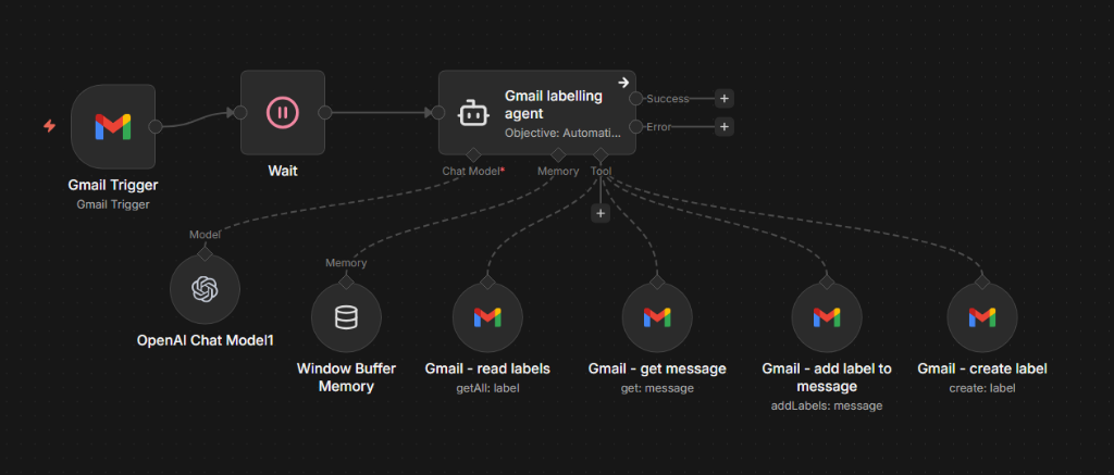 This workflow automates email categorization in Gmail using the Gmail API and OpenAI's language model. It periodically checks for new emails, reads their content, and categorizes them based on existing Gmail labels. If no matching label is found, the workflow creates a new label and assigns it to the email, ensuring a dynamic and self-organizing inbox system.